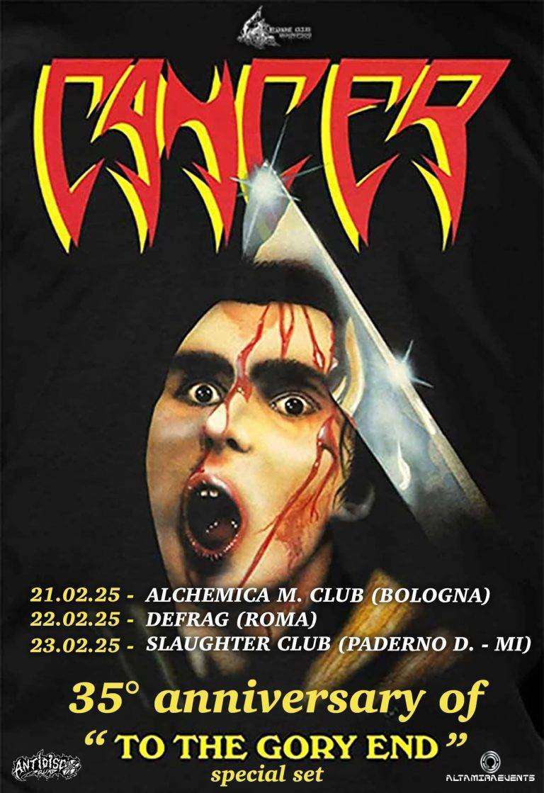 Grave sin Bookings ha annunciato il ritorno in Italia per tre show esclusivi degli inglesi Cancer, che a febbraio del 2025 saranno in tour per celebrare degnamente i 35 anni di un cult album come ‘To The Gory End’ con un set speciale studiato per l’occasione. Della formazione originale è rimasto il vocalist e chitarrista originale John Walker.