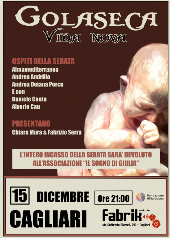I Golaseca e l’associazione culturale Ulasica, presentano il nuovo lavoro intitolato “Vida Nova”, il 15 Dicembre alle ore 21 al Fabrik, in via Mameli 216 In questa occasione i Golaseca presenteranno il nuovo disco in anteprima in una esibizione di arte e beneficenza, con tanti artisti Sardi che accompagneranno la serata dove l’ingresso sarà gratuito e l’intero incasso della vendita del disco sarà devoluto all’associazione “Il sogno di Giulia” che da sempre si occupa di bambini in difficoltà.