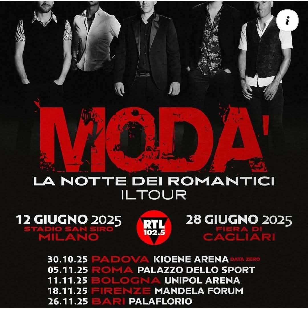 Non sarà più solo una sola NOTTE DEI ROMANTICI ma quello che hanno annunciato oggi I MODÀ (che in carriera hanno ottenuto 1 disco di Diamante, 31 dischi di Platino, 9 dischi d’Oro, oltre ad aver venduto quasi 2 milioni di dischi, registrato sold out negli stadi e nei palazzetti e raggiunto 3 milioni e mezzo di persone sui social network) è un vero e proprio ritorno live.