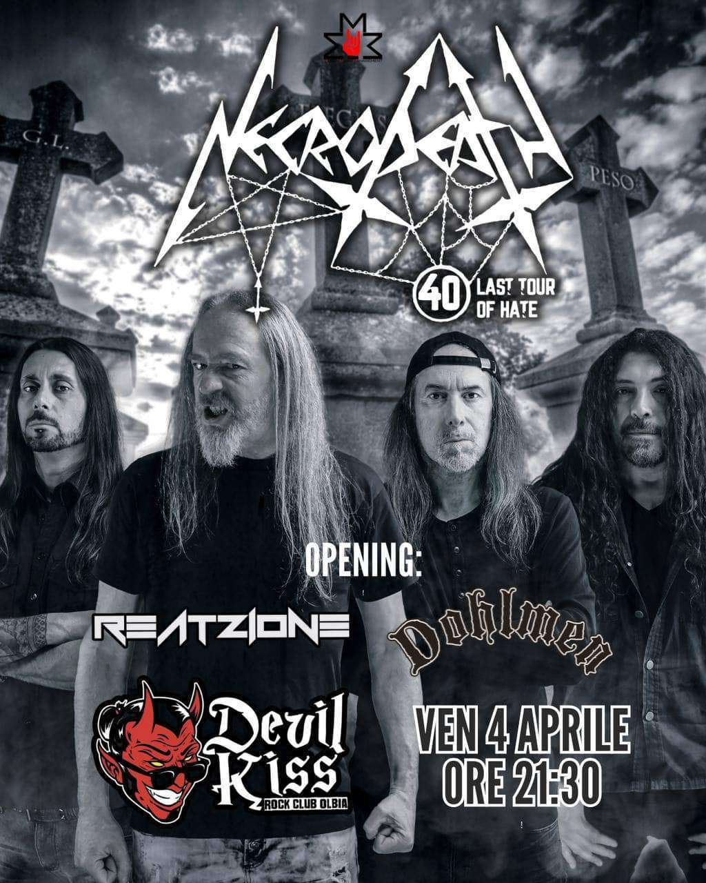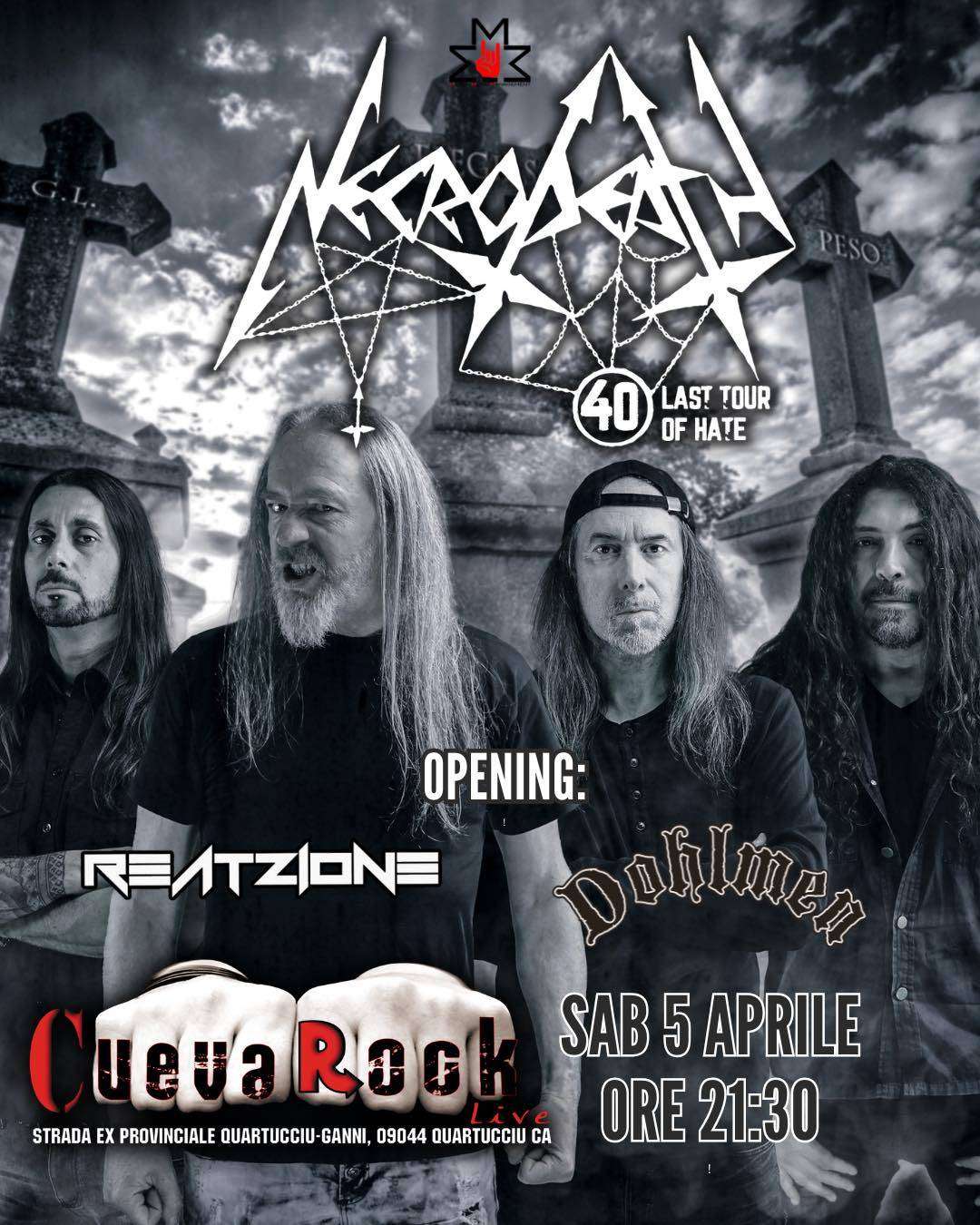 I leggendari black-thrasher italiani Necrodeath tornano in Sardegna dopo 7 anni per quello che è il loro tour celebrativo per i 40 anni di leggendaria carriera, nonché il tour di addio.