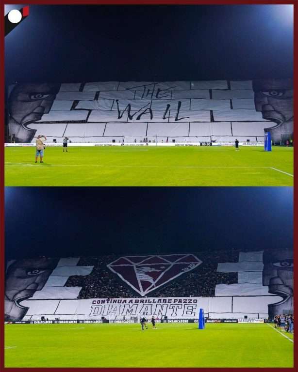 I teli scesi dall’alto e distesi su tutta la curva “Sud Siberiano” riportavano immagini del muro della copertina di “The Wall” con una delle facce presenti sulla cover di “The Division Bell” (ideate da Storm Thorgerson). A seguire un altro telo rimanda alla copertina di “The Dark Side Of The Moon” con tanto di bandiera arcobaleno.