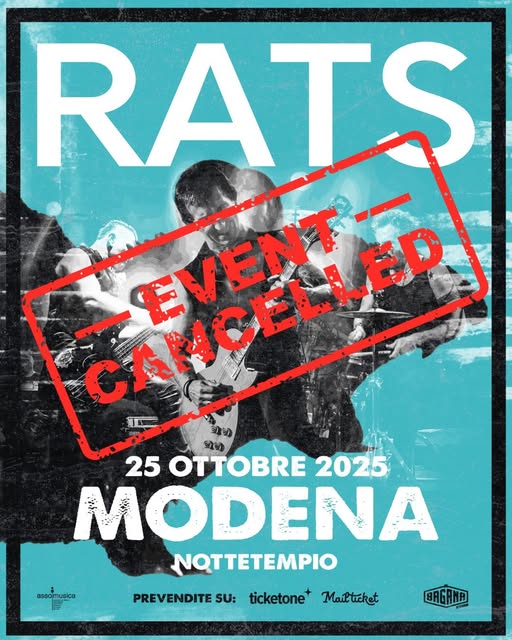 Bagana Music Agency comunica che la data dei Rats, inizialmente prevista al NotteTempio in data Sabato 25 Ottobre, verrà annullata.