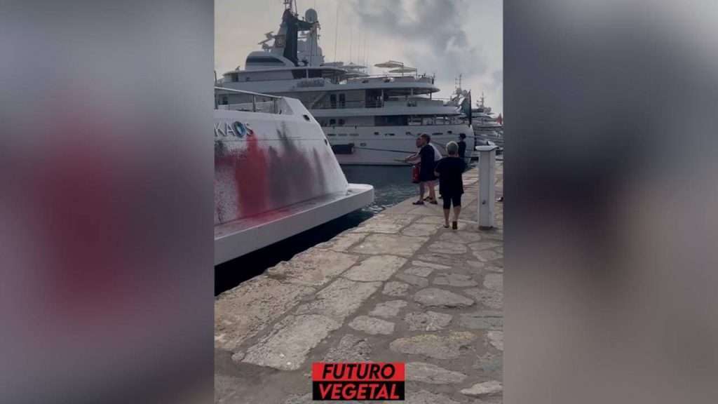 Gli attivisti per il clima di Futuro Vegetal hanno spruzzato della vernice contro il superyacht Kaos, la lussuosa imbarcazione di Nancy Walton Laurie: l’erede dell’azienda Walmart.