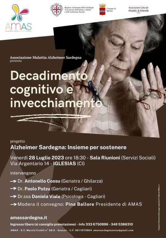 Venerdì 28 luglio alle 18.30, nella Sala Riunioni (servizi sociali) di via Argentario 14 a Iglesias, si svolgerà un importante convegno dedicato al “Decadimento cognitivo e invecchiamento”, parte integrante del progetto “Alzheimer Sardegna: Insieme per sostenere”, organizzato dall’Associazione Malattia Alzheimer Sardegna (AMAS) in collaborazione con l’associazione Culturale Music&Movie, e sostenuto dall’assessorato dell’Igiene e Sanita e dell’Assistenza Sociale della RAS.