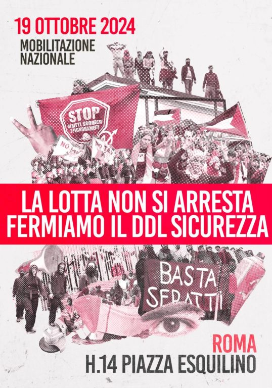 Le pratiche di lotta come i picchetti fuori dai posti di lavoro e in difesa degli sfratti, le azioni dirette contro le grandi opere che consistono nei presìdi e nelle invasioni di aree di importanza strategica, le occupazioni di edifici pubblici e le forme di solidarietà, punite come la cessione di una sim ad un migrante senza permesso di soggiorno, non possono essere considerate delitti contro l’incolumità pubblica o foriere di incubare strategie terroristiche, come afferma il DDL, ma necessarie forme di lotta che hanno consentito l’avanzamento delle tutele oggi esistenti ma che si vogliono cancellare definitivamente.