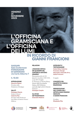 Il 21 novembre 2025: alle ore 15.30, presso la Fondazione di Sardegna in via Carlo Alberto 7, si svolgerà l’iniziativa intitolata “L’officina gramsciana e l’officina dei Lumi, in ricordo di Gianni Francioni”, momento di memoria e omaggio all’illustre studioso sassarese recentemente scomparso.