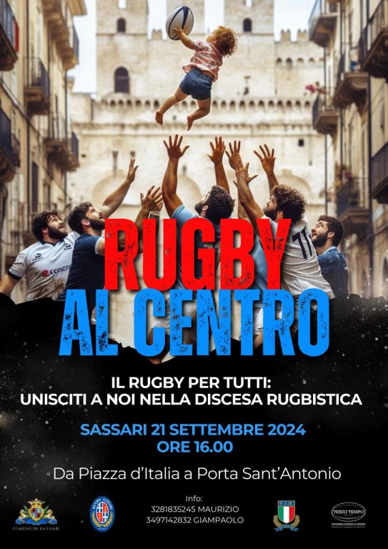 Ed il presente riparte e si colora dell’entusiasmo generato da “Rugby al Centro”, iniziativa che fa parte del progetto “Il rugby include”. Obiettivo? Diffondere il messaggio che il rugby è per tutti! Una passeggiata per le vie del centro storico cittadino – organizzata con il patrocinio e il supporto del Comune di Sassari – animata da un gruppo di 15 giocatori, giocatrici, Old e supporter di tutte le età con indosso la divisa della società chiamati a creare piccole azioni di gioco su strada coinvolgendo i passanti, i curiosi, gli appassionati, gli amministratori e chiunque abbia voglia di divertirsi e provare a conquistare l’ambita t-shirt. Nel corso dell’attività saranno distribuiti flyer informativi per il reclutamento di nuovi giocatori e un invito alla festa per i 25 anni della società. La passeggiata prevede un incontro in piazza d’ Italia per poi svilupparsi nelle piazze principali lungo il Corso e poi concludersi in Piazza Tola. Terzo tempo ospitato nella pizzeria.. Terzo Tempo, padrone di casa una bandiera del rugby come Rino Berdini. Fra touche e rolling maul, “azzadda” e mischie tutti dovranno toccare la palla. Divertirsi, provare e condividere l’esperienza sarà un obbligo. Anzi, quasi un dovere.