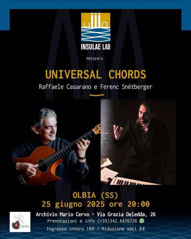 “Universal Chord” è l’incontro di due musicisti che abitano la musica come linguaggio universale che connette popoli e culture del mondo. Protagonisti di questo incontro sono due artisti di rilievo internazionale: il sassofonista salentino Raffaele Casarano e il chitarrista ungherese Ferenc Snétberger. Una straordinaria produzione originale firmata Insulæ Lab – Centro di Produzione Musica che mercoledì 25 giugno alle ore 20 debutterà bello splendido abbraccio offerto dall’Archivio “Mario Cervo” di Olbia, in via Grazia Deledda nr 26. Info e prenotazioni al 3426476726; ingresso intero al costo di 10 euro, riduzione soci 8 euro.