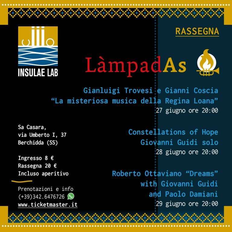 Dopo le armoniose – ed apprezzate – suggestioni dona alla straordinaria platea di Sa Casara in occasione dei tre concerti della rassegna “A Love Supreme”, l’estate di Insulae Lab – Centro di produzione Musica continua a declinarsi pronta a regalare una nuova opportunità d’ascolto, una nuova pagina del racconto, una nuova rassegna strutturata ancora una volta in tre diversi appuntamenti (27, 28 e 29 giugno) e caratterizzata da un nome familiare ed evocativo: “Lampadas”.