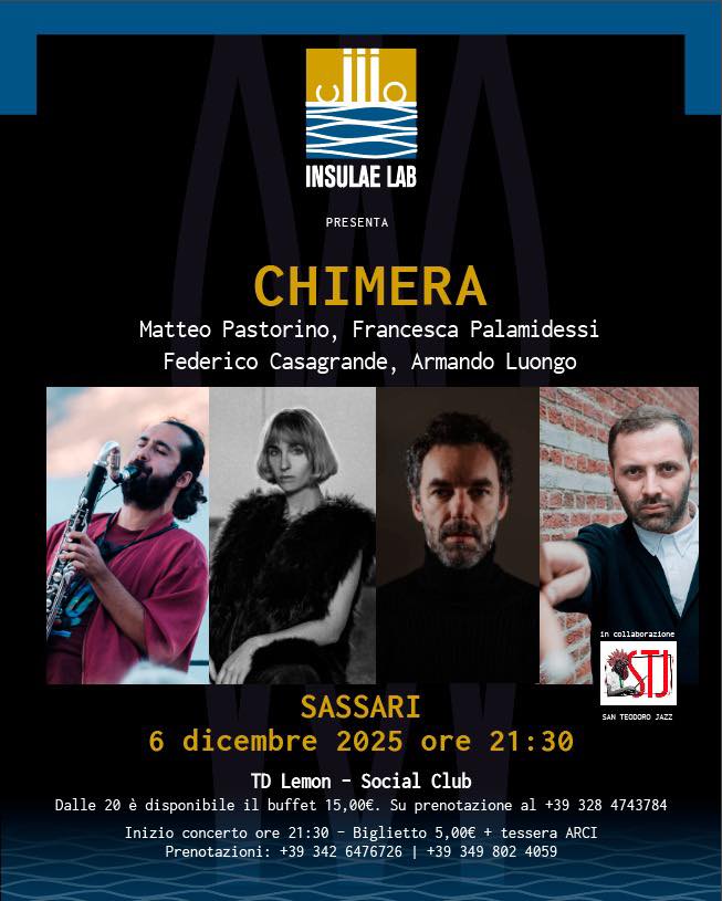 “Chimera” è un’apparizione sonora, che prenderà forma per voce, mani, intenti, connessioni e suoni immaginati, fusi e regalati alla platea dall’ideatore del progetto Matteo Pastorino (clarinetti, elettronica), Francesca Palamidessi (voce, testi in italiano, elettronica), Federico Casagrande (chitarra, elettronica) e Armando Luongo (batteria, elettronica). Accadrà a Sassari, alle ore 21.30 di sabato 6 dicembre sul palco del TD Lemon – Social Club, strada nr 22 zona Predda Niedda. Info e prenotazioni al 3426476726 e 3498024059. Ingresso 5 euro + tessera Arci; dalle ore 20 disponibile un buffet su prenotazione al 3284743784.