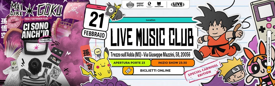 Il Carnevale 2026 parla la lingua della nostalgia, dell’energia e delle sigle che hanno segnato un’intera generazione. Venerdì 21 febbraio 2026, il Live Club di Trezzo sull’Adda ospita Mai Dire Goku, la Cartoon Live Experience più grande d’Italia: un party tematico unico che trasforma le sigle dei cartoni animati, gli anime giapponesi e le serie TV cult in uno show collettivo tutto da cantare e vivere. Non una semplice serata in discoteca, ma un evento immersivo e interattivo che unisce DJ set, musica live, animazione, scenografie a tema, coriandoli ed effetti speciali, creando un’atmosfera capace di riportare il pubblico direttamente negli anni ’90 e 2000.