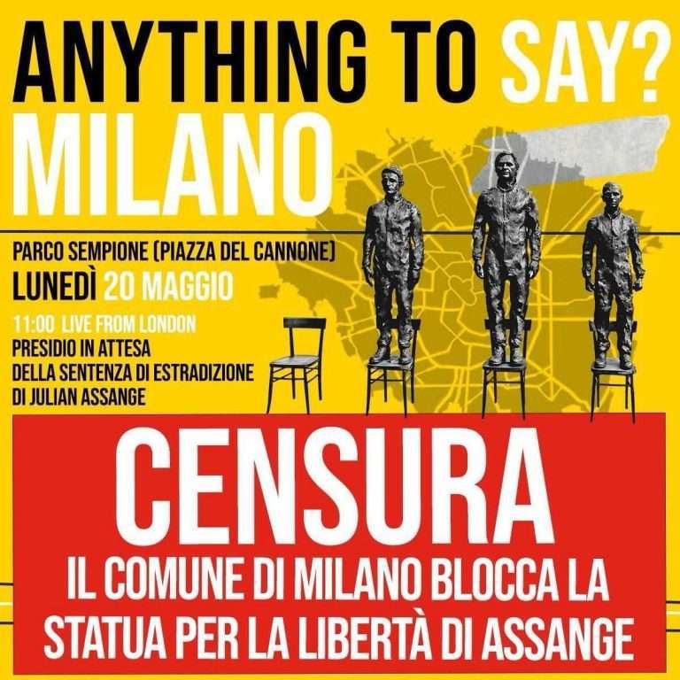 Ma martedì, il Comune meneghino ha fatto di più. “Dopo due mesi di contatti negli uffici comunali e la protocollazione a pagamento di quanto necessario, il Comune di Milano ha negato la concessione del suolo pubblico per l’opera di Davide Dormino, Anything to Say? a Monument to Courage, senza offrire motivazioni“, scrivono il Comitato italiano per la liberazione di Julian Assange in un post Facebook. L’installazione raffigura quattro sedie, tre occupate dalle statue di Julian Assange, Edward Snowden e Chelsea Mannig e una vuota per chiunque voglia salirci sopra, prendendo posizione. Un’opera che simboleggia il coraggio di chi lotta per difendere la libertà di espressione e informazione nel mondo e che sarebbe dovuta essere posizionata in Piazza del Cannone a Parco Sempione, dal 20 al 23 maggio, accompagnando una raccolta firme a sostegno dell’attivista australiano. E il tutto era definito e ben organizzato con tanto di locandina.
