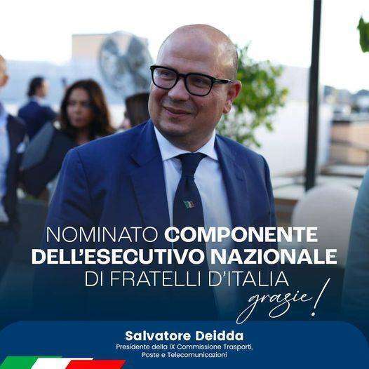 “Sono felice e onorato di essere stato nominato componente dell’esecutivo nazionale di Fratelli d’Italia. Ringrazio il Presidente Giorgia Meloni e il gruppo dirigente di Fratelli d’Italia per la fiducia nei miei riguardi e per la linfa che questa nomina porterà ai militanti e alla classe dirigente sarda, in continua crescita”, inizia così il post pubblicato da Salvatore Deidda sui social.