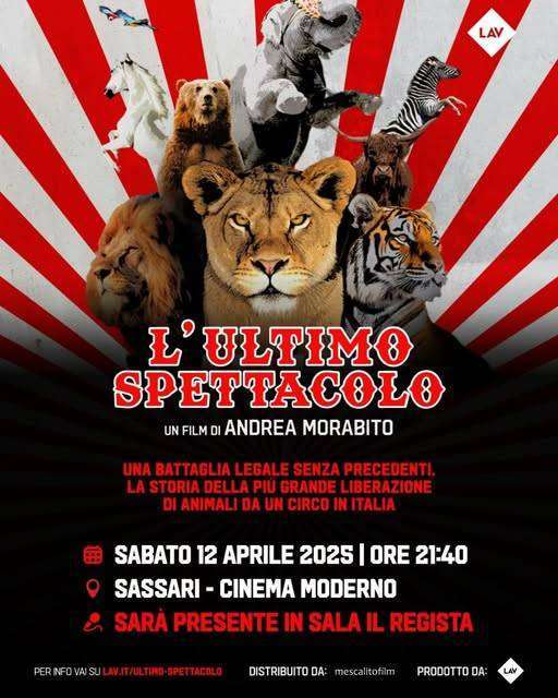Sabato 12 aprile alle 21:40 al Cinema Moderno di Sassari proiettiamo L’Ultimo Spettacolo, il film di Andrea Morabito prodotto da LAV, che racconta la storica liberazione degli animali dal Circo Martin.