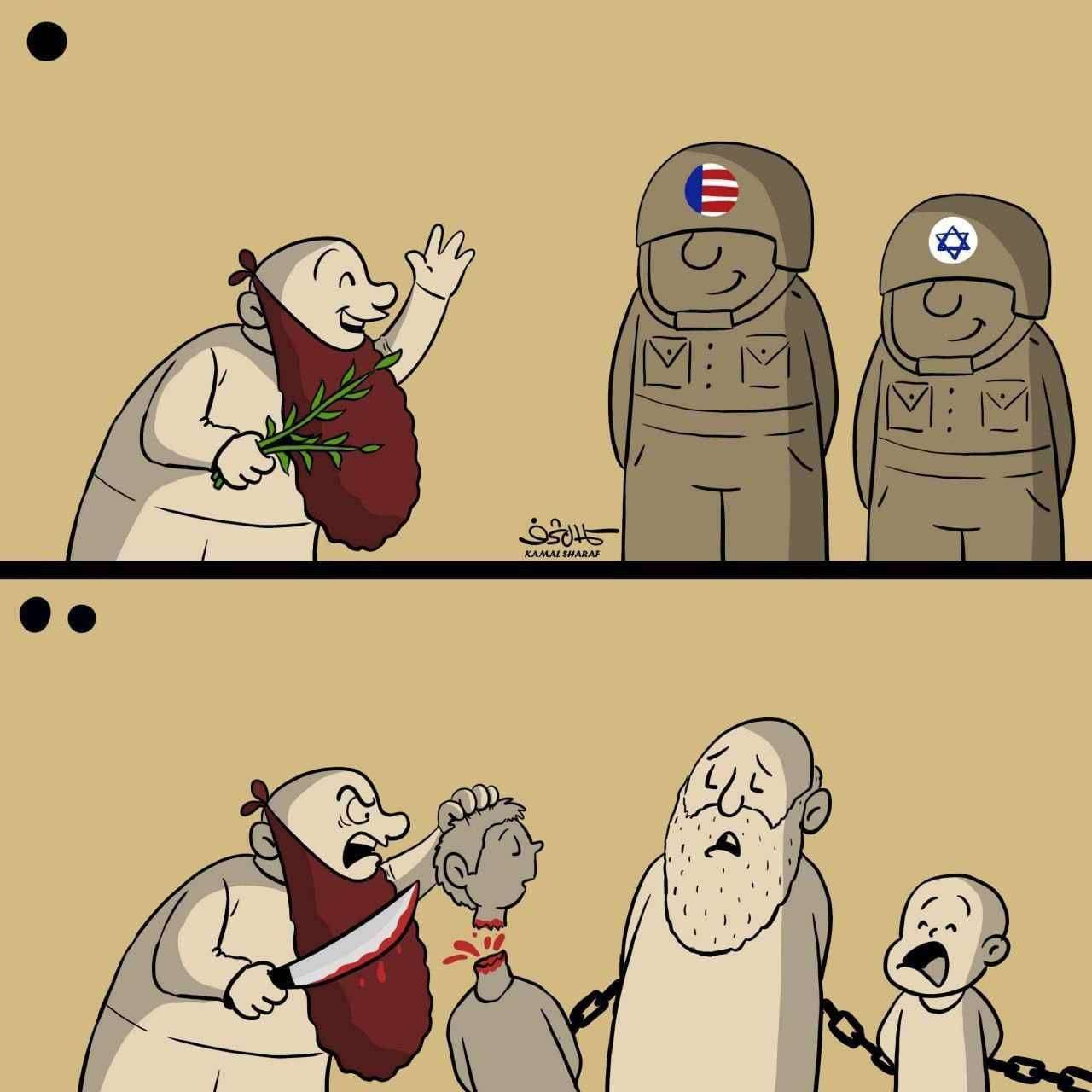Sui social, nel mondo arabo sciita, la vignetta è stata ricondivisa ed è diventata subito virale: ecco il vero volto dei sunniti finanziati da Paesi del Golfo, regime israeliano e Usa.