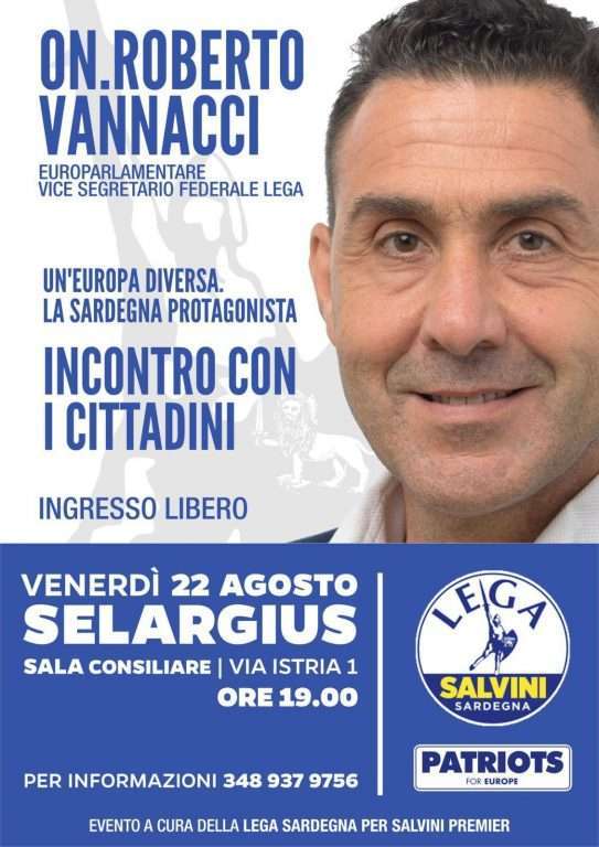Venerdì 22 agosto, alle ore 19.00, presso la Sala Consiliare di Selargius (via Istria 1), si terrà un incontro pubblico con l’On. Roberto Vannacci, europarlamentare del gruppo Patriots for Europe e vice segretario federale della Lega.