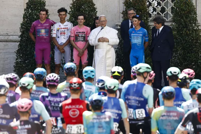 Il Giro d’Italia è arrivato in Vaticano e Papa Leone XIV ha salutato i ciclisti.  Ha ricevuto la maglia rosa.