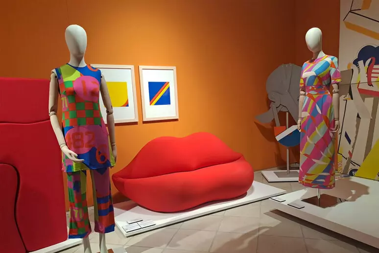 Ci sono gli abiti e gli accessori rivoluzionari di stilisti come Roberto Capucci, Emilio Pucci con gli occhiali che si espandono nel colore, Elio Fiorucci con le sue grandi innovazioni, Missoni, Mila Schon, Gucci. Poi gli oggetti di design che sono rimasti nella storia come la sedia Selene di Vico Magistretti, la lampada da tavolo di Gae Aulenti, il componibile di Kartell disegnato da Anna Castelli Ferreri. Ma anche i fumetti di Diabolik, i quadri di Valerio Adami e l’arte che sconfina nel cinema popolare di Fantozzi come la sedia sacco nel suo sfavillante rosso fuoco.