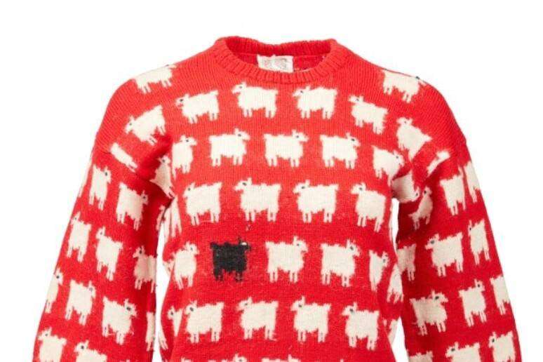 Il pullover rosso dalle maniche a sbuffo su cui una pecora nera spicca in un gregge di pecore bianche è stato venduto durante un’asta online dedicata a una serie di “icone della moda”.