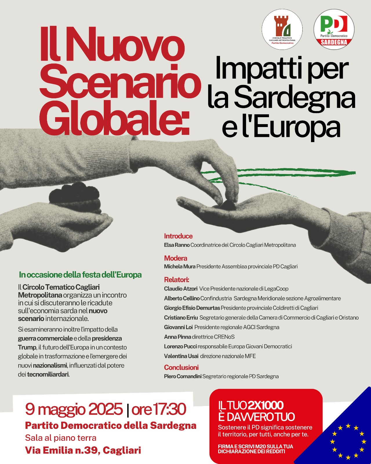 Il Circolo tematico del Partito Democratico della Sardegna, “Cagliari Metropolitana”,organizza, al suo esordio pubblico, in occasione della festa dell’Europa, il 9 maggio 2025,alle ore 18:00 presso la sede di Via Emilia, 39 a Cagliari, un incontro per discutere di Europa e di Sardegna nell’attuale contesto globale in trasformazione, che vede l’emergere di nuovi nazionalismi, influenzati dal potere dei tecnomiliardari.