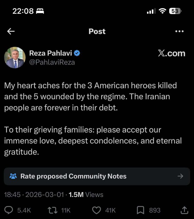 Lo spregevole e indegno ‘principe’ ereditario a vita Reza Pahlavi, rimasto in complice silenzio di fronte al barbaro assassinio di 165 bambine e insegnanti in una scuola elementare nel sud dell’Iran e al martirio di numerosi altri civili in tutto l’Iran nella criminale aggressione israelo-americana, ieri sera, dopo che gli Stati Uniti hanno ammesso la morte di almeno 3 loro soldati, ha scritto: “il mio cuore soffre per i 3 eroi americani uccisi”.