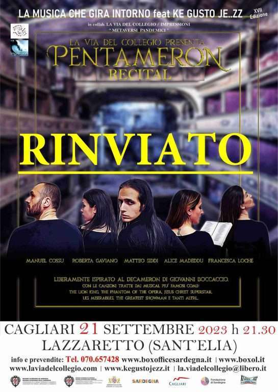 Dopo il successo di “Best of musical”, prodotto dalla Via del Collegio, la compagnia cagliaritana Luma il 21 settembre 2023 alle ore 21:30, torna sul palco del Lazzaretto S. Elia per la rassegna “La musica che dira intorno” a cura dell’organizzazione “Via del Collegio”, con uno show fresco e denso di significato, che include alcune delle più belle canzoni tratte dai musicali più noti al mondo come: The phantom of the opera, The Lion King, The greatest showman, Les miserables e tanti altri. Cinque artisti che si sono distinti nell’ambito del musical del panorama sardo, in progetti completamente originali come “Il Templare” di Manuel Cossu o The Woman Song di “Toto Alcades”, presentano “Pentameron” Scritto da Luna Alcades e Matteo Siddi, con la regia Javiddhi Luma, la direzione musicale di Manuel Cossu, scene di Tiberio Velati, coreografie di Claudio Schëmberg, costumi di Roberto Bortolussi e le luci di Lucio Scine.