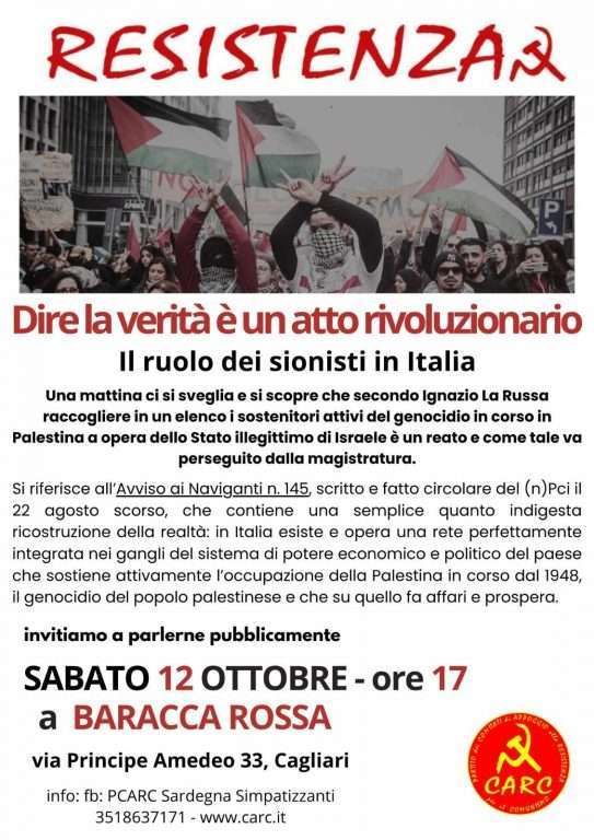 “Informare e conoscere i nomi, i cognomi e le attività dei complici del genocidio in Palestina è dire la verità. sono gli stessi che nel nostro paese speculano e fanno profitto sulla pelle dei lavoratori e delle masse popolari, gli stessi che devastano il nostro territorio, commerciano sulla guerra imperialista, smantellano le attività produttive e licenziano per “ottimizzare” i budget aziendali”…” Invitiamo alla lettura e discussione dell’editoriale di Resistenza di settembre (https://www.carc.it/2024/09/02/dire-la-verita-e-un-atto-rivoluzionario-2/) che parla della canea mediatica attorno alla pubblicazione dell’ Avviso ai Naviganti 145 del (n)PCI (https://nuovopci.it/dfa/2024/145/avvnav145.html) e invita ad approfondire e rilanciare”, scrive ancora il Carc che da appuntamento sabato 12 ottobre dalle ore 17 a Baracca Rossa in via Principe Amedeo 33 a Cagliari