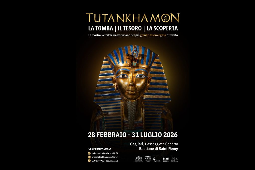 Dal 28 febbraio al 31 luglio 2026 la Passeggiata Coperta del Bastione di Saint Remy ospita “Tutankhamon. La tomba, il tesoro, la scoperta”, una mostra che porta a Cagliari le uniche repliche ufficiali del corredo funerario del “faraone bambino”, certificate dal Ministero delle Antichità Egiziano. Gli originali, oggi conservati al Grand Egyptian Museum, non viaggiano più. Queste riproduzioni sono dunque l’unico modo per vedere da vicino la maschera funeraria, i sarcofagi, i carri, le statue protettrici e gli oggetti personali del “Golden Boy”.