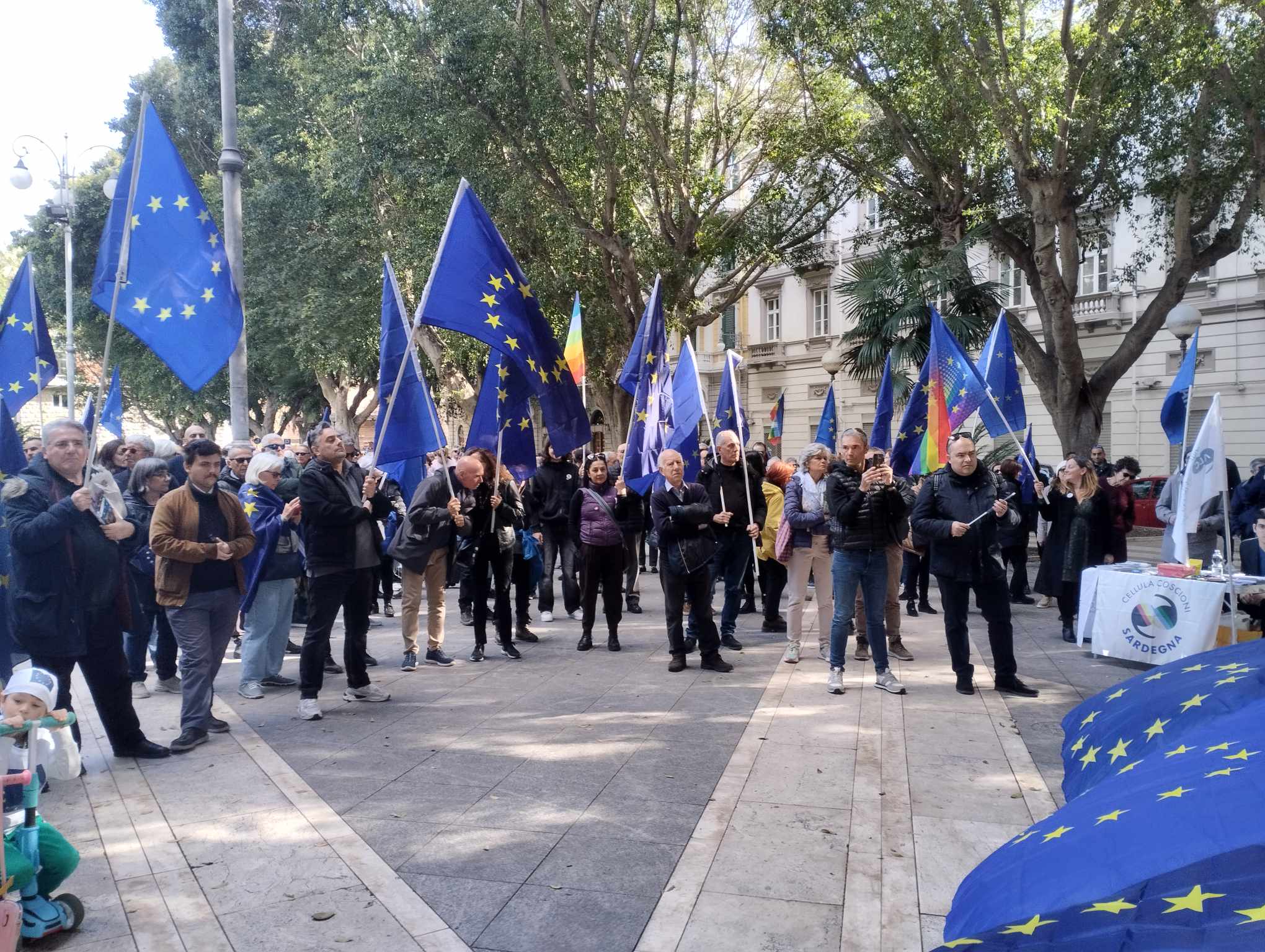 Tutti insieme in piazza del Carmine, al centro di Cagliari, per la mobilitazione nazionale “Una piazza per l’Unione”, a favore dell’Europa unita.