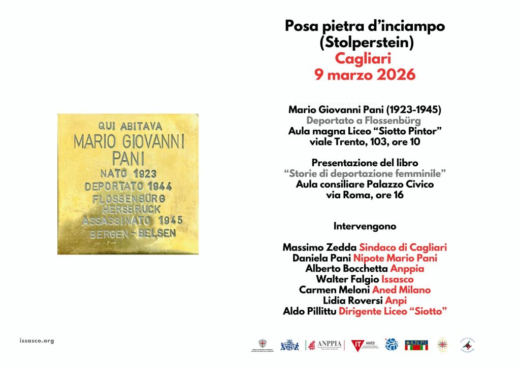 Il primo alle 10, nell’aula magna del Liceo Siotto per un momento di pubblico di presentazione e riflessione: parteciperanno il sindaco, Massimo Zedda, la nipote del deportato, Daniela Pani, i responsabili delle associazioni antifasciste promotrici Alberto Bocchetta (Anppia), Walter Falgio (Issasco), Carmen Meloni (Aned Milano) e Lidia Roversi (Anpi) e il dirigente del liceo, Aldo Pillittu.