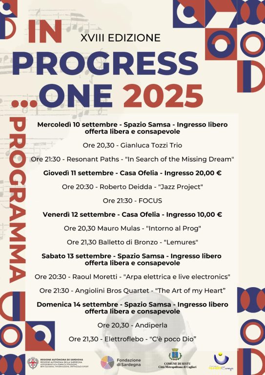 Con la sua diciottesima edizione, dal 10 al 14 settembre 2025 torna a Sestu il festival In Progress…One, ormai istituzionale appuntamento sardo con progressive rock e contaminazioni, sperimentazioni jazz e avanguardie musicali. Dieci i concerti in programma, ospitati quest’anno sia nella consueta cornice di Casa Ofelia (via Parrocchia 88) sia nello Spazio Samsa (via Gramsci 5) grazie all’organizzazione dell’associazione Mediteuropa col sostegno dell’Assessorato regionale della Cultura, della Fondazione di Sardegna e del Comune di Sestu. A corredo delle esibizioni musicali, una mostra fotografica ed esposizioni artistiche, un angolo food con degustazione di vini e specialità gastronomiche prodotte dalle imprese locali.