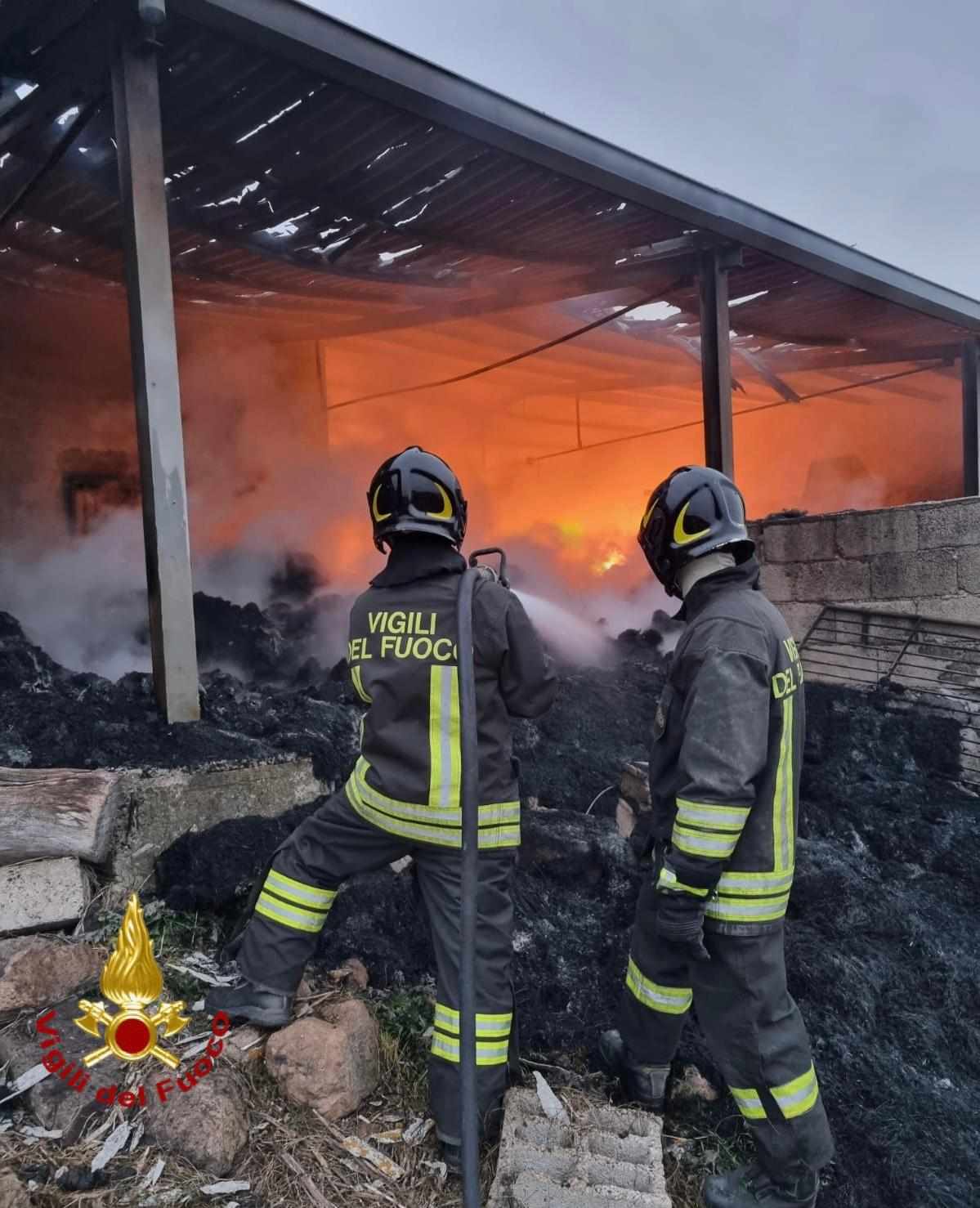 I Vigili del Fuoco sono intervenuti nella notte dove la struttura di circa 300 metri quadri è stata completamente investita dalle fiamme, che hanno interessato alcune rotoballe, due trattori e una vettura.