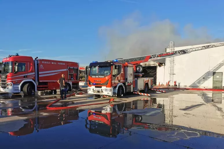 I mezzi agricoli che si trovavano nel capannone sono stati portati all’esterno e salvati dalla furia del fuoco che ha invece distrutto un primo capannone e raggiunto l’area uffici,