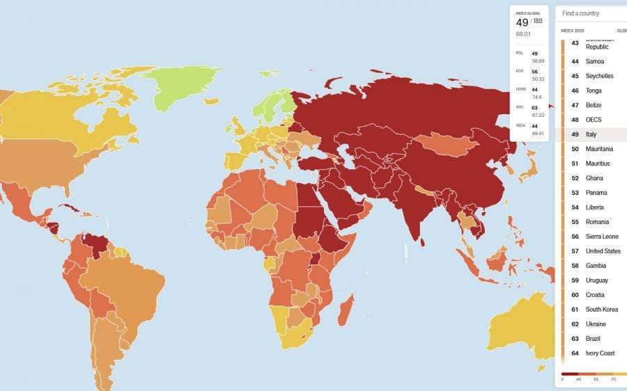 Tre gradini più in basso rispetto al 2024: dal 46° al 49° posto. Il risultato peggiore in Europa Occidentale. In uno scenario globale che vede la libertà di stampa sempre più minacciata ovunque, l’Italia si posiziona dietro Paesi come Samoa, Tonga o il Belize (è un Paese sulla costa orientale dell’America Centrale), colorata di un arancione che – nel planisfero pubblicato venerdì 2 maggio 2025 sul sito web di Reporter senza frontiere – spicca tra il giallo pur cupo del resto d’Europa e il nord Africa.