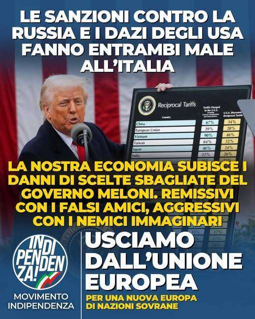“Purtroppo l’Italia sembra essere entrata nella classica tempesta perfetta. Dopo avere promosso ed accettato una serie di Sanzioni economiche contro la Russia, considerata un nemico immaginario, adesso si ritrova anche con i Dazi doganali imposti dai finti amici degli USA. Ovviamente la Unione Europea preferisce parlare di riarmo ed appare incapace di una strategia comune e divisa al suo interno tra gli egoismi francesi, le paure tedesche e la russofobia dei Paesi baltici. Il governo Meloni rimane paralizzato in un equilibrismo dannoso per gli interessi nazionali