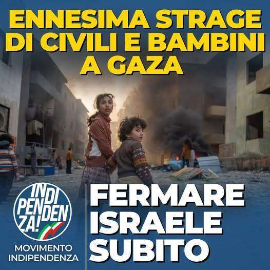 “Altri nove civili uccisi a Gaza. Tra loro una donna incinta e un bambino. Queste sono solo le ultime vittime degli attacchi indiscriminati di Israele sulla Striscia. Questa non è difesa, è genocidio. Con più di 44.000 morti e oltre 100.000 feriti dall’inizio dell’ultima offensiva, siamo di fronte a una tragedia umanitaria che il mondo non può continuare a ignorare. La comunità internazionale deve agire ora”, afferma in una nota sui social il Movimento Indipendenza.