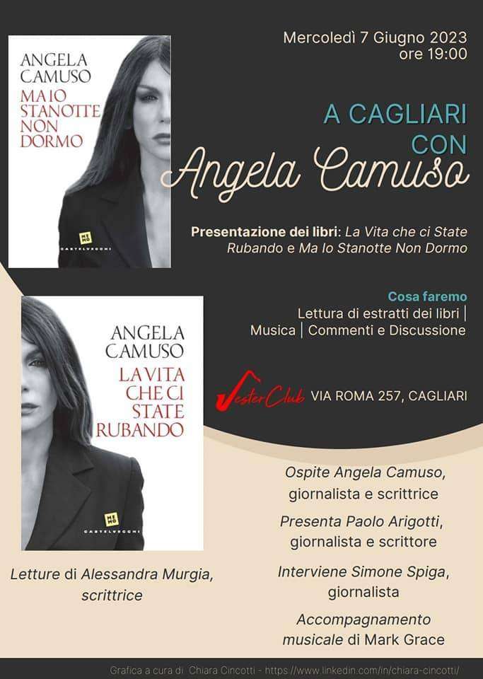 Angela Camuso, scrittrice e giornalista di inchiesta, presenterà i libri “Ma io stanotte non dormo” e “La vita che ci state rubando” (Castelvecchi Editore) incalzata dalle domande dei colleghi Paolo Arigotti e Simone Spiga, Direttore di ReportSardegna24.