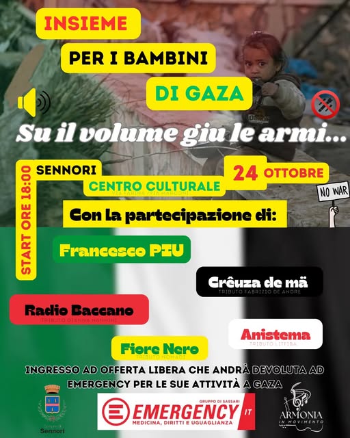Il concerto è in programma il 24 ottobre dalle ore 18 a Sennori presso il Centro Culturale (Via Farina / Via Marconi) con ingresso ad offerta libera. Il ricavato sarà interamente devoluto a Emergency per le sue attività umanitarie a Gaza.