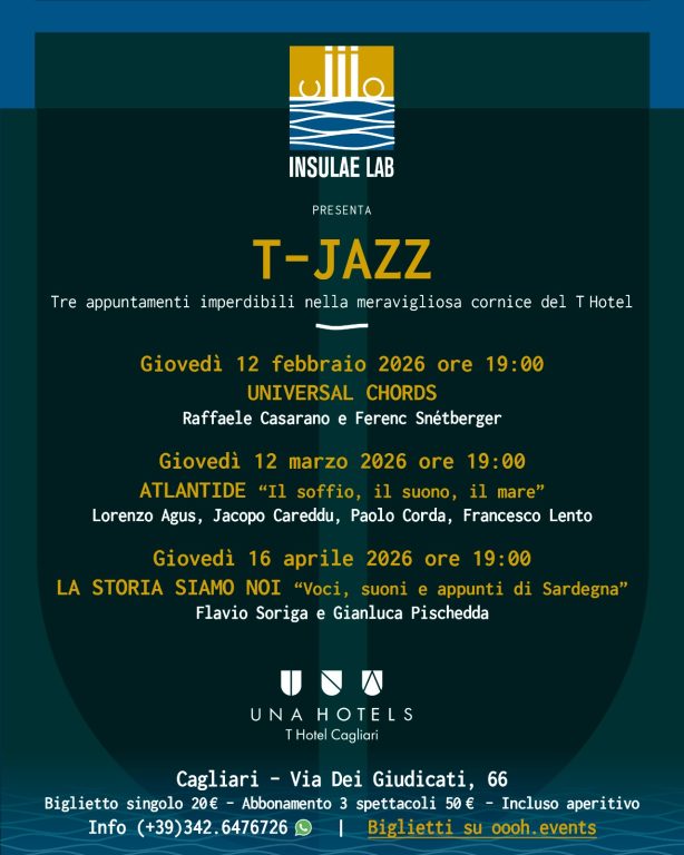 “UNIVERSAL CHORDS”, con Raffaele Casarano e Ferenc Snétberger in programma giovedì 12 febbraio 2026 (h 19); “ATLANTIDE – Il soffio, il suono, il mare” con Lorenzo Agus, Jacopo Careddu, Paolo Corda e Francesco Lento in programma giovedì 12 marzo 2026 alle ore 19 e “LA STORIA SIAMO NOI – Voci, suoni e appunti di Sardegna” con Flavio Soriga e Gianluca Pischedda in programma giovedì 16 aprile 2026 (h 19). Tre occasioni speciali, da ascoltare immersi nella bellezza dell’intenzione che li ha generati. Biglietto singolo al costo di 20 euro, abbonamento ai tre concerti 50 euro (aperitivo incluso); info al 3426476726. Ticket disponibili su oooh.events.