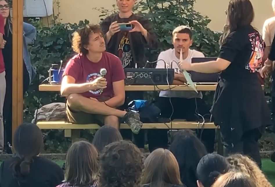 L’incontro, sotto forma di botta e risposta tra gli studenti e l’artista Jorit, si è tenuto nell’aula/area green del Liceo, dove il pittore muralista (“non mi definisco artista e non so cosa voglia dire”, ha detto agli studenti), nato come street artista, in quadro di dialettica civica e aperta che sa calibrarsi in formazione didattica individuale, a uso e consumo di giovani creativi, si è sottoposto a mitragliate di domande di studenti. Jorit sollecitato dagli studenti ha raccontato del suo profilo di formazione, passante per l’Alta Formazione Artistica di Napoli (“Il mio Maestro di cattedra è stato Ninì Sgambati, un concettuale che mi ha aperto la mente, ma che dal punto di vista della tecnica e del fare pittorico non mi ha trasmesso niente.”), ha plasticamente disegnato le sue idee su cosa debba essere un creativo in età contemporanea (“Obey è stato un mio modello di riferimento, ma non ho condiviso la sua posizione sul conflitto Russia-Ucraina”, e parlando del conflitto Israele-Palestina, in relazione alla sua esperienza d’artivista: “pensate se a Napoli arrivasse lo stato d’Israele e dicesse questa non è più casa tua!”).