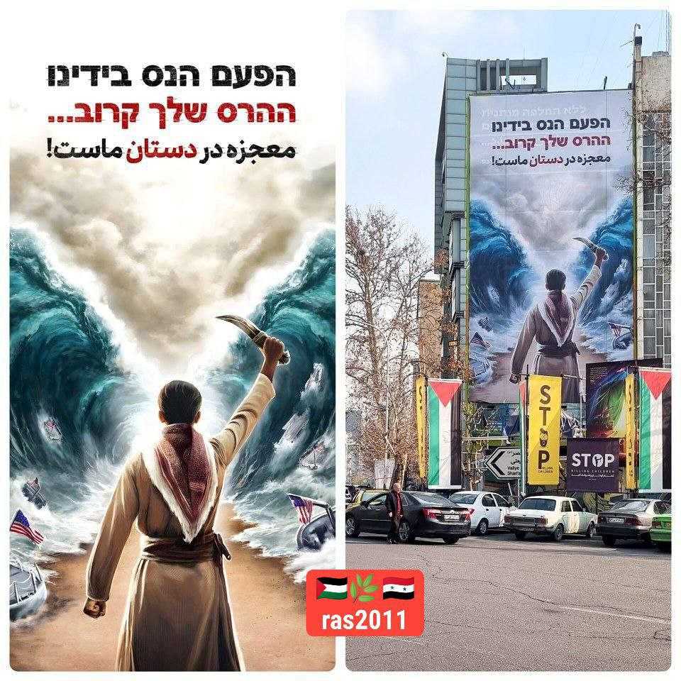 Nuovo murale in Piazza Palestina a Teheran raffigurante un guerriero yemenita con il suo pugnale tradizionale che, come il bastone di Mosè, divide l’oceano distruggendo le truppe del Faraone, rappresentate oggi dagli americani nel Mar Rosso.