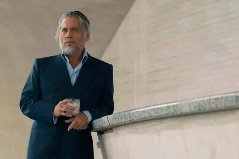 La foto mostra Johnny appoggiato al bancone di un bar con un cocktail in mano, un abito blu elegante e lo sguardo accigliato.