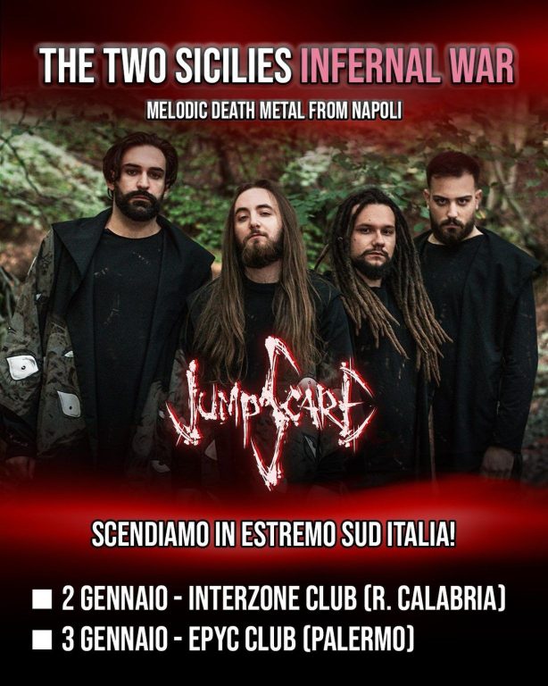 La band Jumpscare, reduce dal Valle Caudina Metal Fest e da tre date in supporto ai Pestilence, annuncia ufficialmente la “mini-run” “The Two Sicilies Infernal War”, una doppietta di date che porterà il gruppo a esibirsi per la prima volta in Calabria e Sicilia.