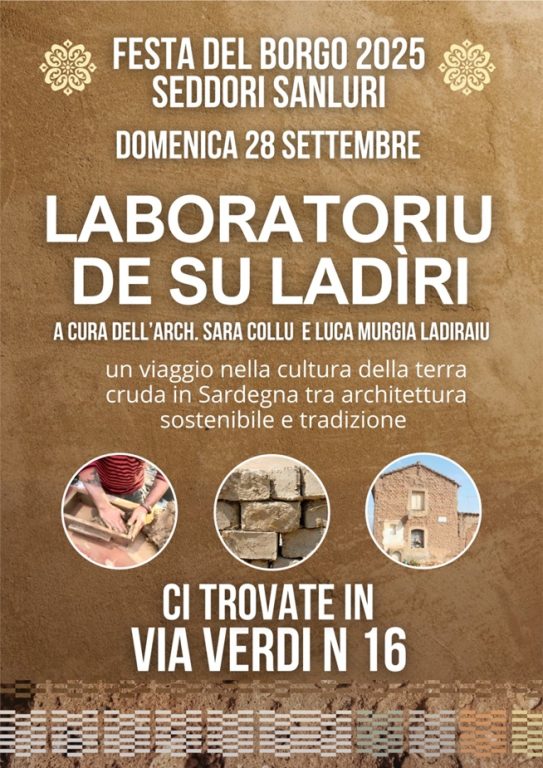 Domenica 28 settembre anche su ladìri, i tipici mattoni di terra cruda, saranno protagonisti in uno stand laboratorio ospitato nella splendida cornice della casa campidanese in via verdi n 16. Il ladiraiu ed esperto in bioedilizia Luca Murgia insieme all’Arch. Sara Collu daranno vita ad un laboratorio esperienziale sulla tematica della terra cruda, materiale naturale antico ma mai così moderno soprattutto se si parla di architettura sostenibile.