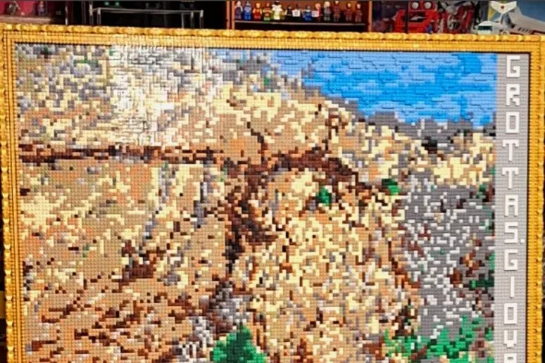 Ci sono voluti 22mila mattoncini Lego e due mesi di lavorazione per realizzare la grotta San Giovanni di Domusnovas sotto forma di un quadro-mosaico della grandezza 150 x 125 centimetri.