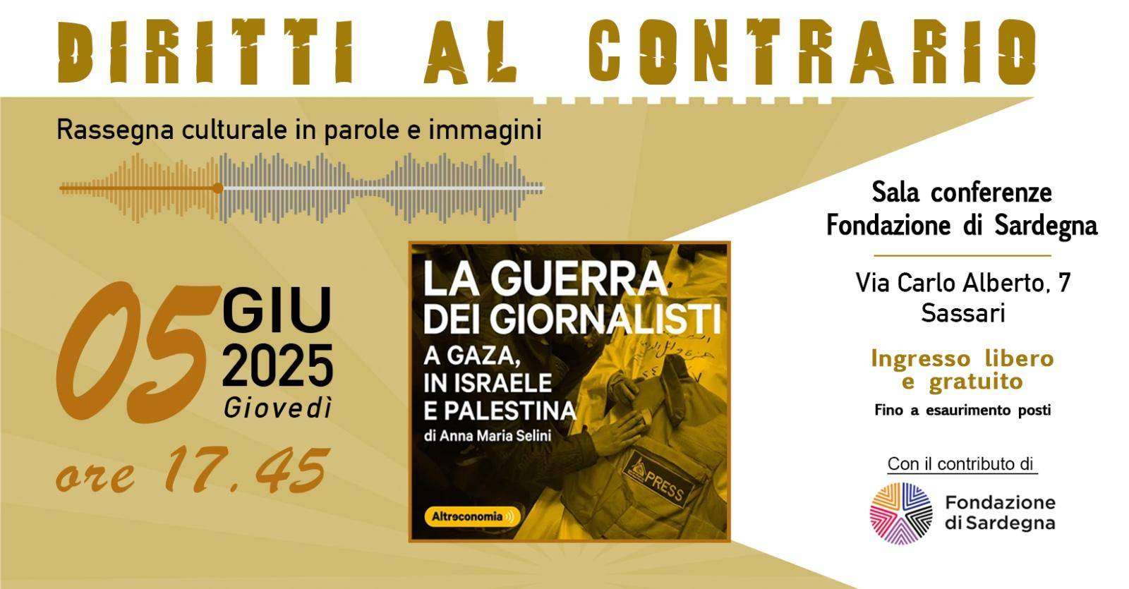 Giovedì 5 giugno 2025, a partire dalle 17:45, presso la Sala conferenze della Fondazione di Sardegna (via Carlo Alberto, 7), si terrà la presentazione del lavoro giornalistico “La guerra dei giornalisti a Gaza, in Israele e Palestina”, prodotto da Altreconomia.