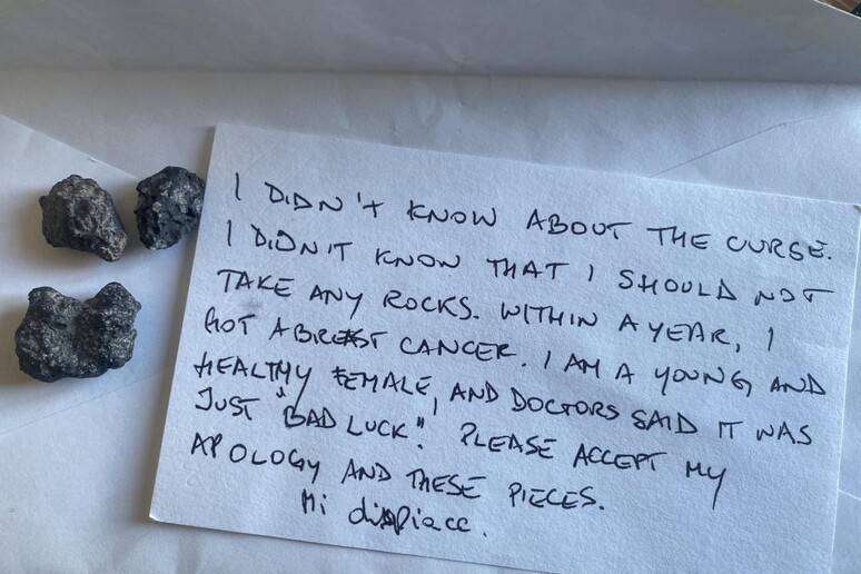 La foto della lettera e dei tre pezzettini di pomice portati via è stata pubblicata su X da Zuchtriegel, con un post, sempre in inglese: “Cara anonima mittente di questa lettera… le pietre di pomice sono arrivate a Pompei… Ora buona fortuna per il tuo futuro e ‘in bocca al lupo’ (in italiano – ndr), come diciamo in Italia”.