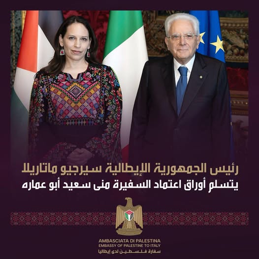 Il Presidente della Repubblica Italiana, Sergio Matarella, ha approvato oggi le credenziali dell’Ambasciatore Mona Saeed Abu Amara come Ambasciatore straordinario dello Stato di Palestina presso la Repubblica Italiana.