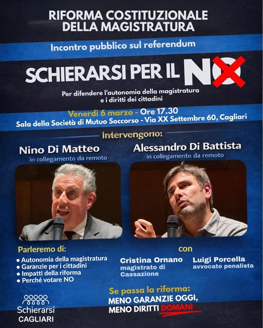 La riforma della magistratura entra nel vivo, e con lei il Referendum che è previsto fra due settimane, per questo Alessandro Di Battista e Nino Di Matteo si collegheranno per un convegno in programma a Cagliari per il No.