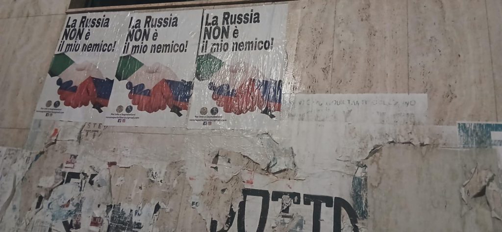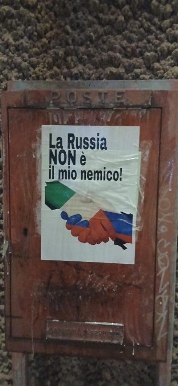 Adesivi con il logo di Fratelli d’Ucraina, proiezioni dei documentari di Russia Today, questi manifesti contro la guerra, sono chiare dimostrazioni che il popolo non sta con chi ci governa e con chi continua a finanziare la guerra imperialista della Nato.